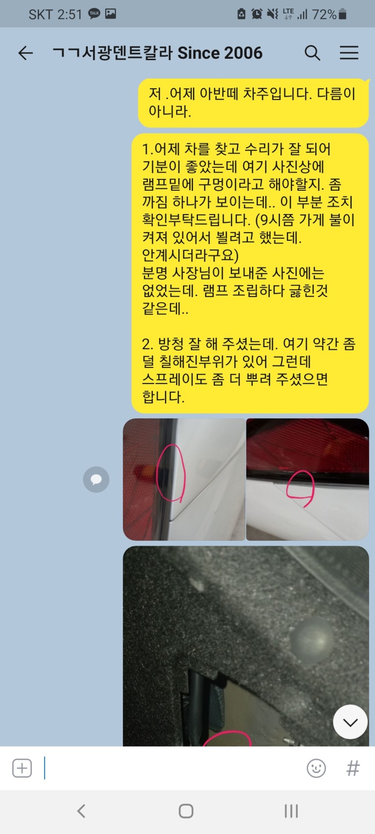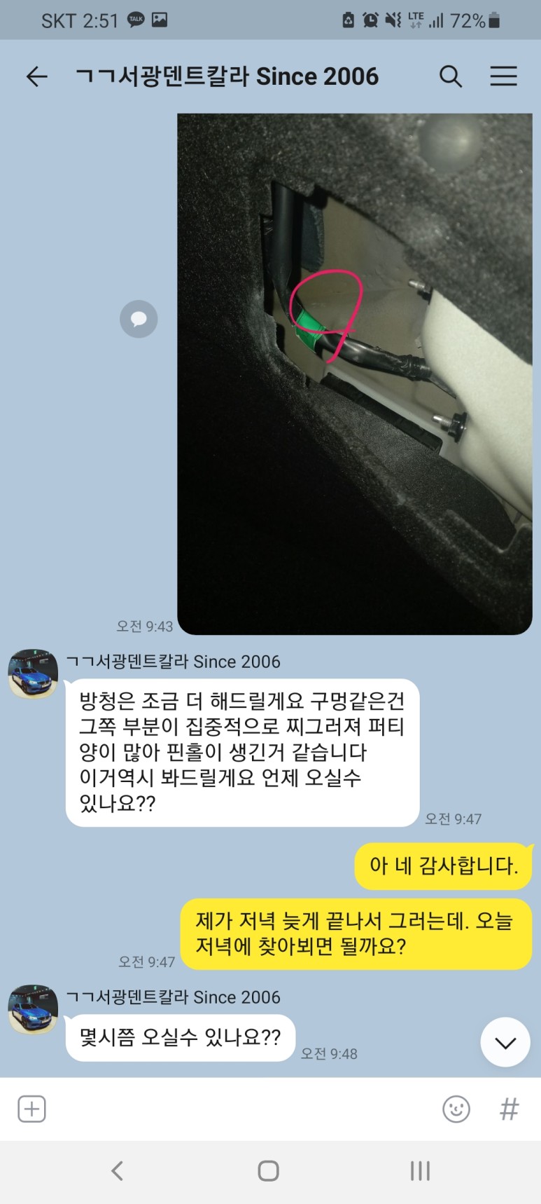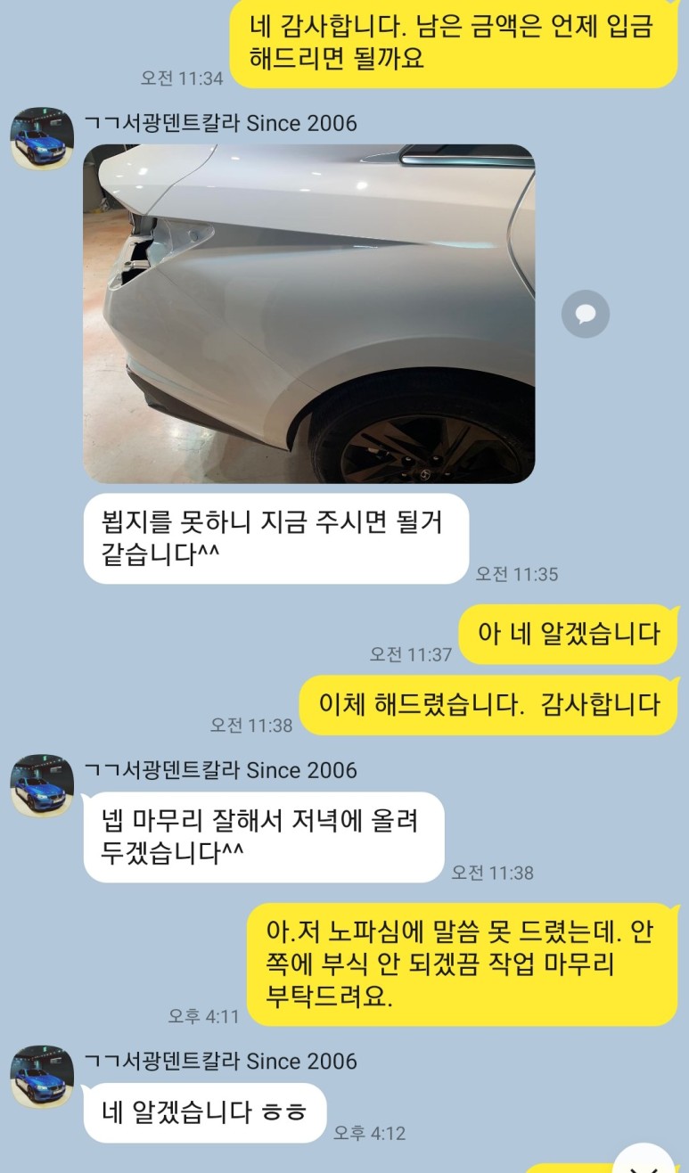 그렇게 차를 찾은 시기가 저녁 9시라서. 밤 늦게 전화하고 문의 하는건 아닌거 같아 아침에.. 저렇게 톡을 보냈다.