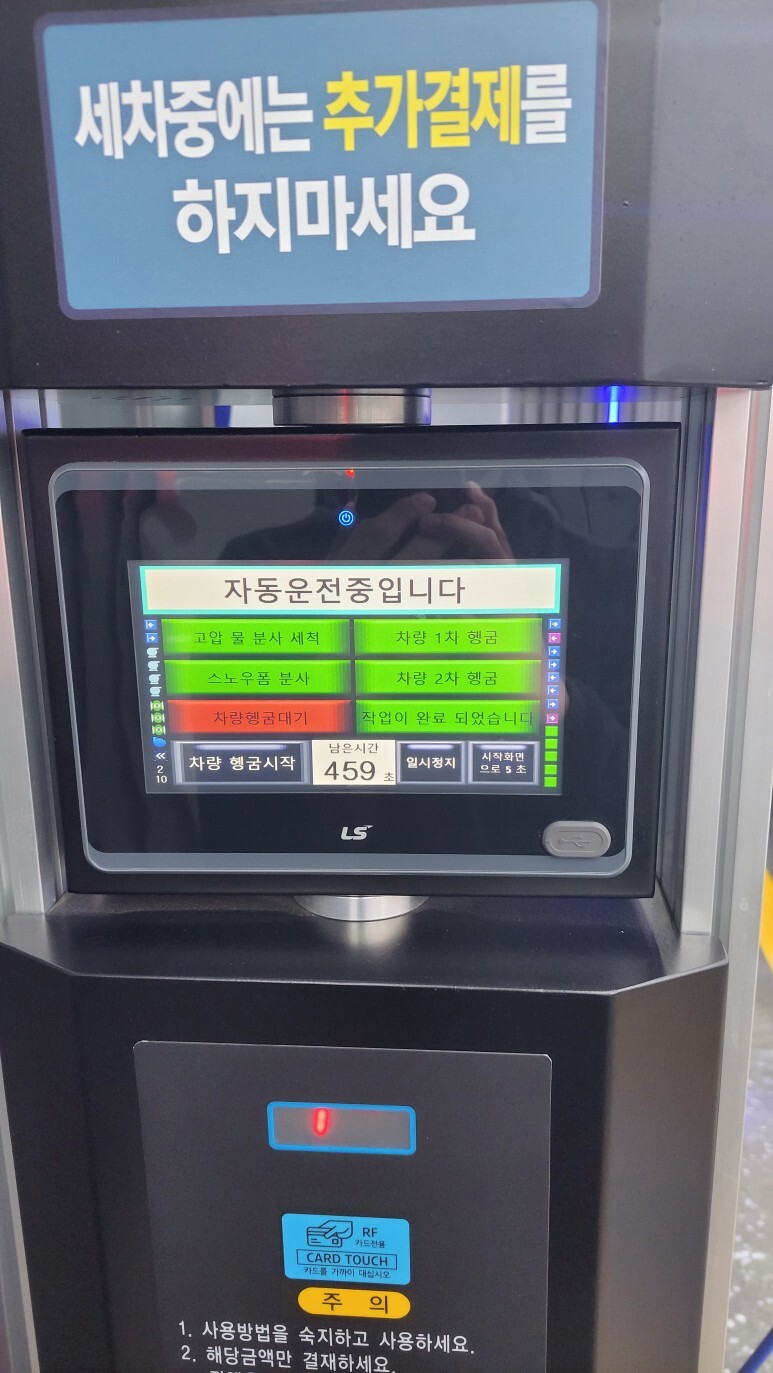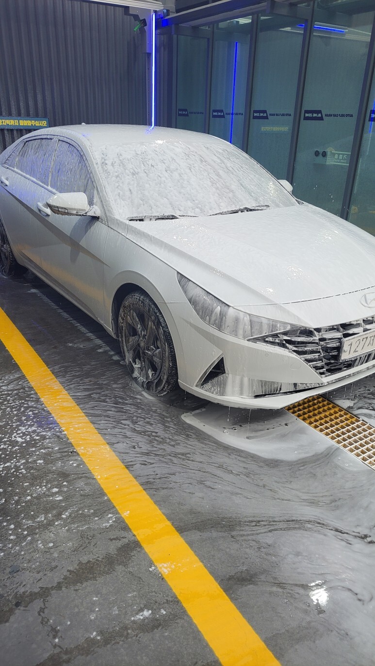 1.자동 세차를 누르고. 대기하자 . 자동으로 물 샤워 하고 폼을 뿌려주는데 폼을 뿌린 상태에서 2.3분 대기 하자