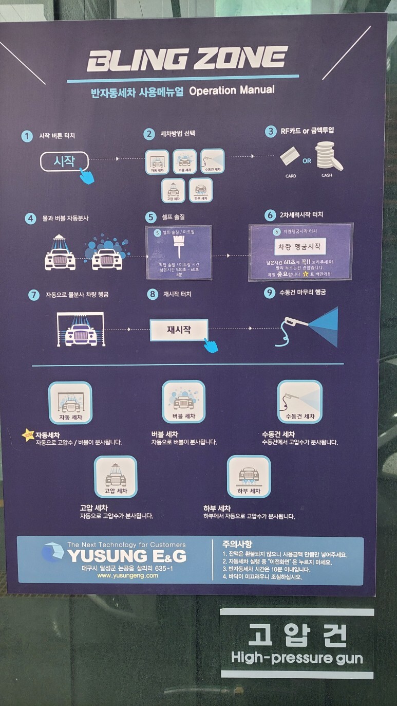 단점. 가격이 좀 비싼듯. 6천원이면 일반 세차장에서 내가 쓰는 금액이랑 비싸다. 기존 셀프세차장은 고압수 2번 사용(4000원)에 에어건(1000원).