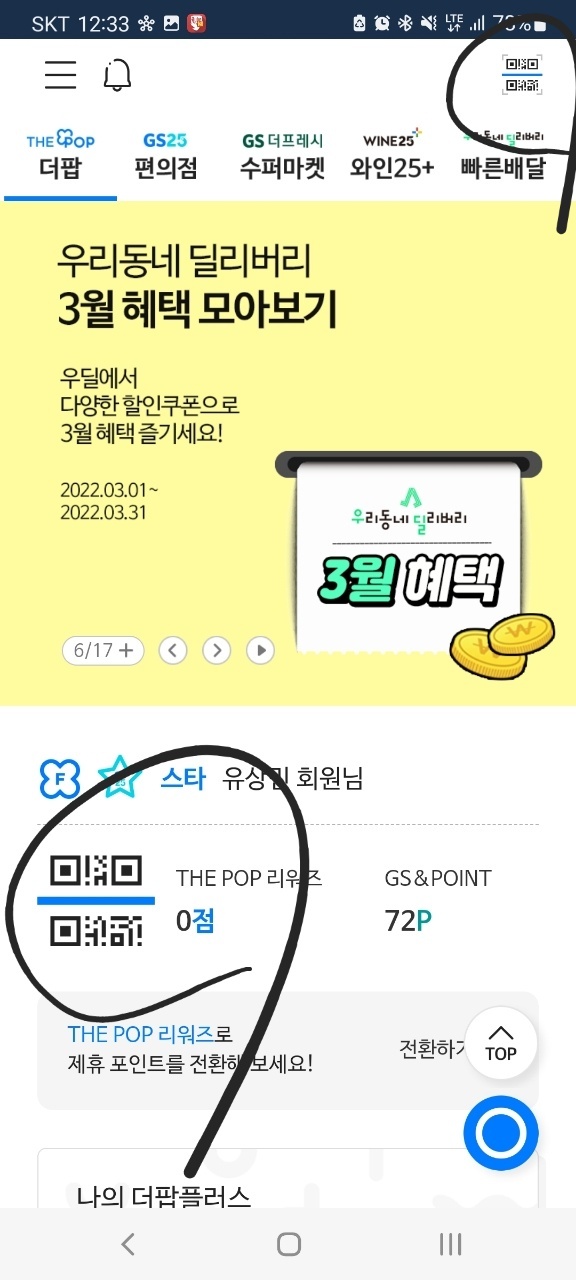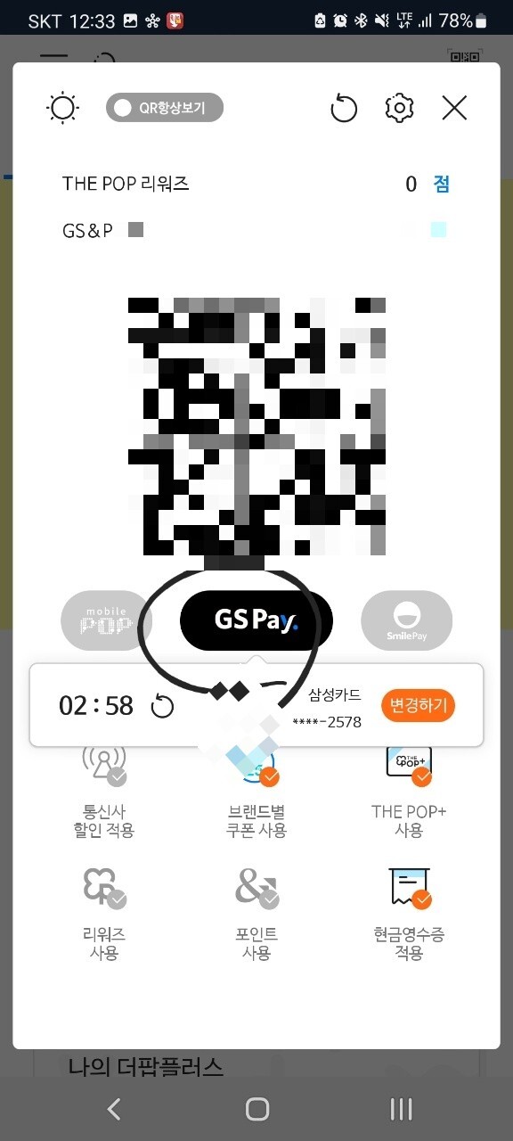 gs페이는 더팝 설치하고 페이를 신용카드로 인증하면 된다. 구매하고 직원에게 말하면 준다.(영수증 보여주면됨)