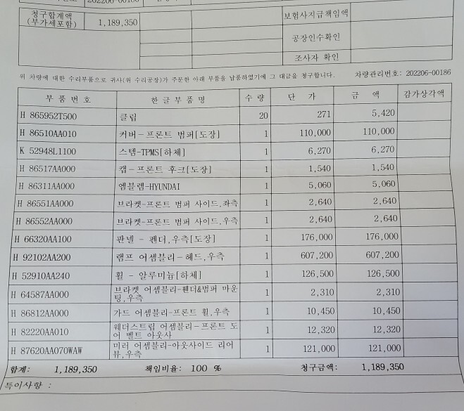 수리비가 차이 나는건 관리자가 보기에 이정도면 되겠지 하는 금액이다. 큰 차이가 나는건 수리 항목 몇개가 빠져서임. 실제로는 비슷하게 나옴..