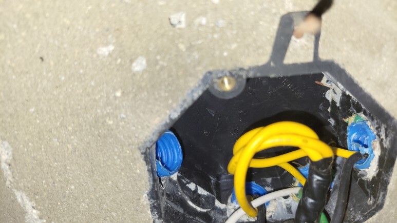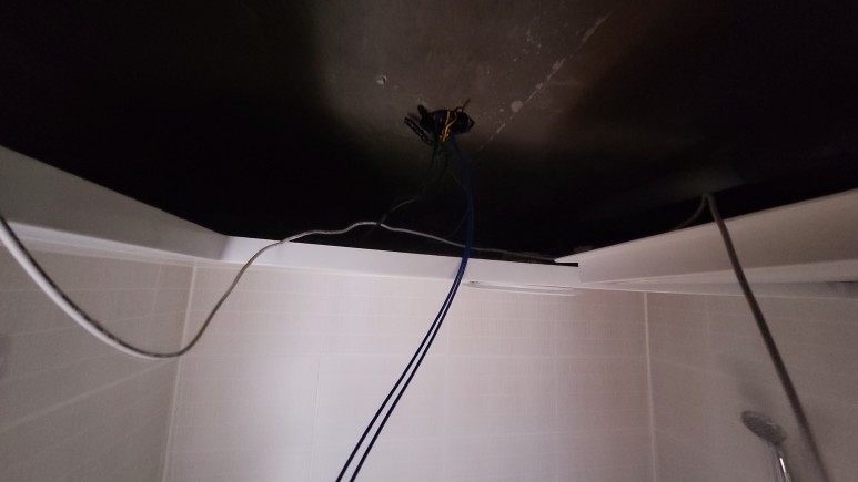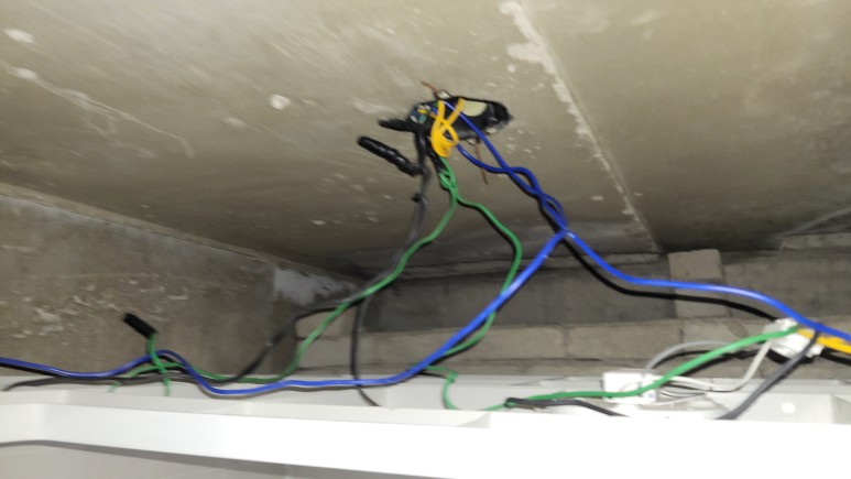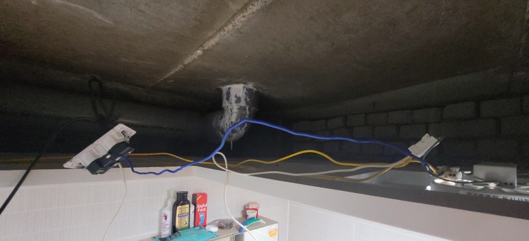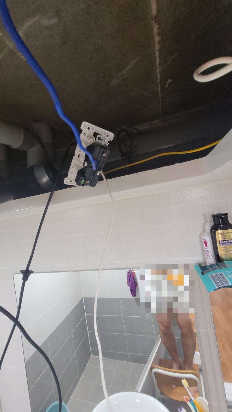 드릴로 천장 구멍 뚫고 선을 뺀 모습. 흰색선이 공통선이고 파란선이.스위치선임.