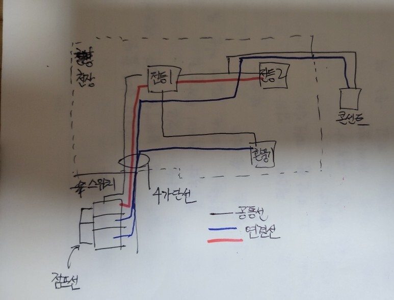 일단 이 방법으로 스위치선을 개별로 넣어서 작업하질 않으면 개별 on.off가 되질 않아서 낭패를 봄. 예를 들어 환풍기나 비데를 쓸려고 하면 무조건 전등이 on되야 하기에. . 자주 전등을 on off하기에 고장의 원인과 환풍기의 경우 자주 on해야 하고 비데도 마찬가지...