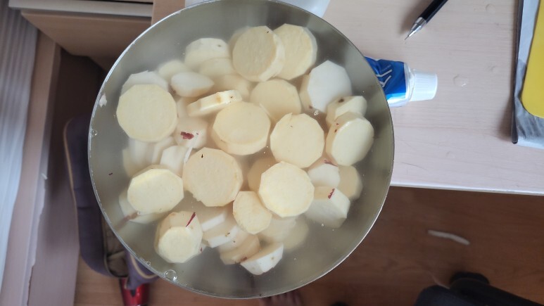 일단 이 요리의 장점은 고구마를 그냥 삶거나 구우면 간혹 썩은 부분이나 상태 안 좋은것에 대해서는 안 먹게 되는데 이렇게 해먹으면 고루지게 다 먹을 수 있다.