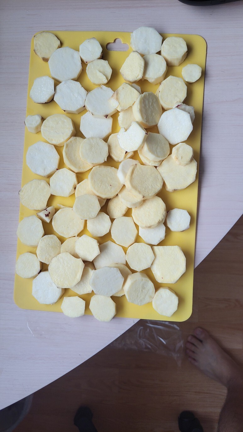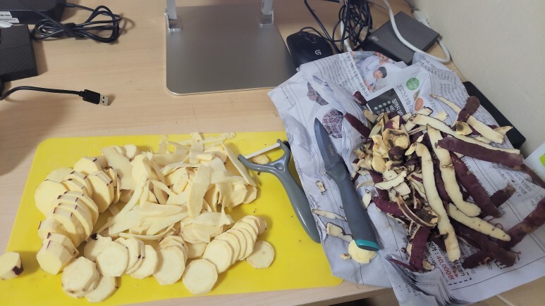2. 고구마를 얇게 썰기 및 기호에 맞게 썰기